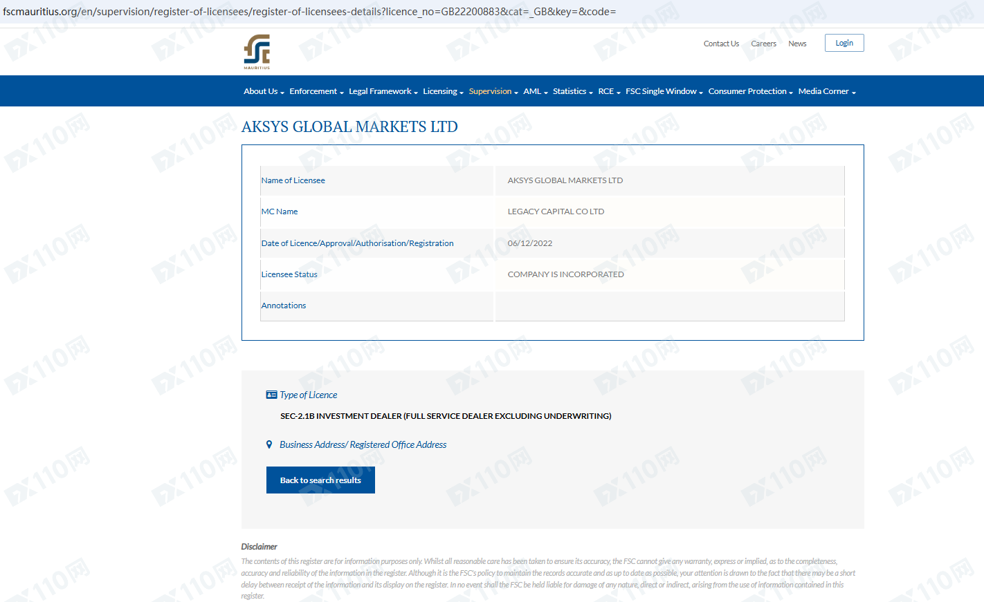 經查詢,在毛里求斯FSC查詢到一家AKSYS GLOBAL MARKETS LTD,但并未登記網址和聯系方式,無法核實,還請謹慎確認!