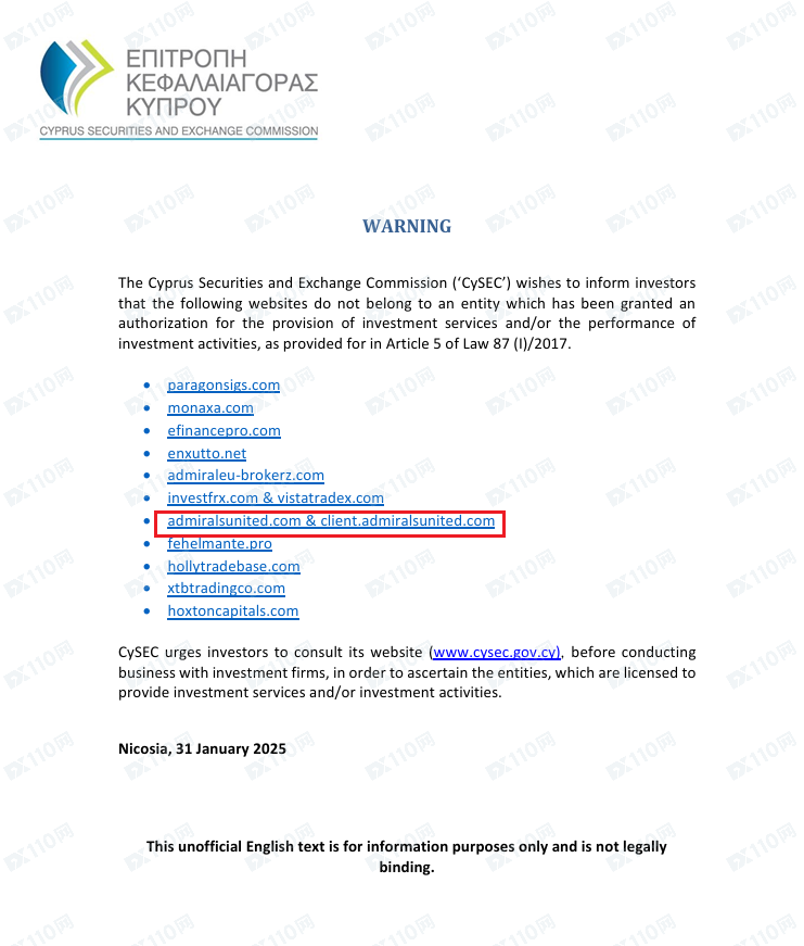 2025年2月7日新增塞浦路斯證券和交易委員會(CySEC)警示圖如下: