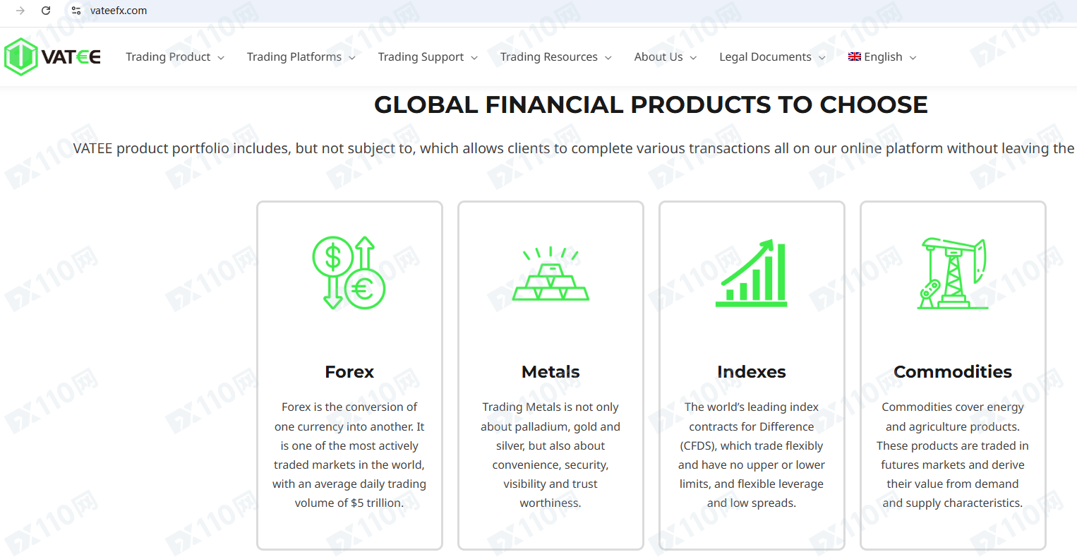 Vatee平臺宣傳所屬Vatee Pty Limited,位于瓦努阿圖,受瓦努阿圖VFSC的監管,公司編號為40097,提供外匯、貴金屬、指數、大宗商品等金融衍生品投資交易服務。