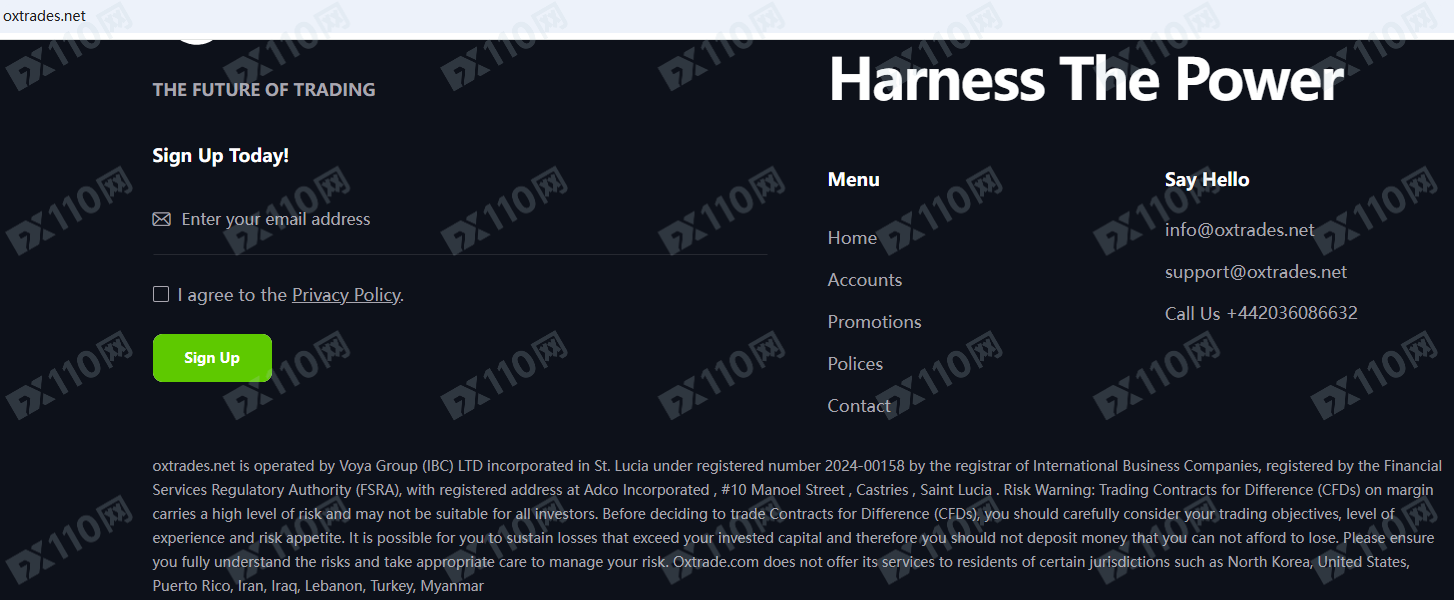 Oxtrades平臺宣傳所屬Voya Group (IBC) LTD,在圣盧西亞注冊成立,由金融服務監管局FSRA注冊,提供外匯、大宗商品、股票、指數、加密貨幣等金融衍生品投資服務。