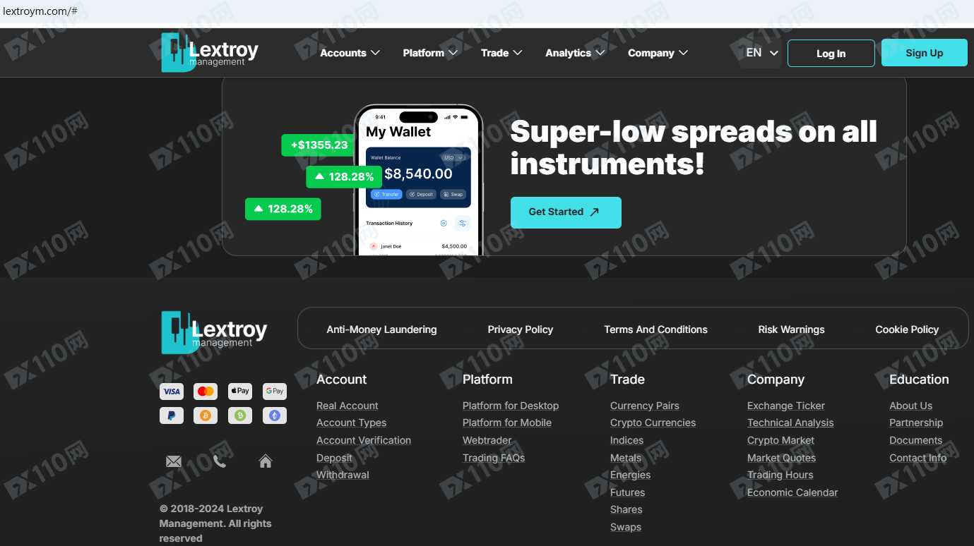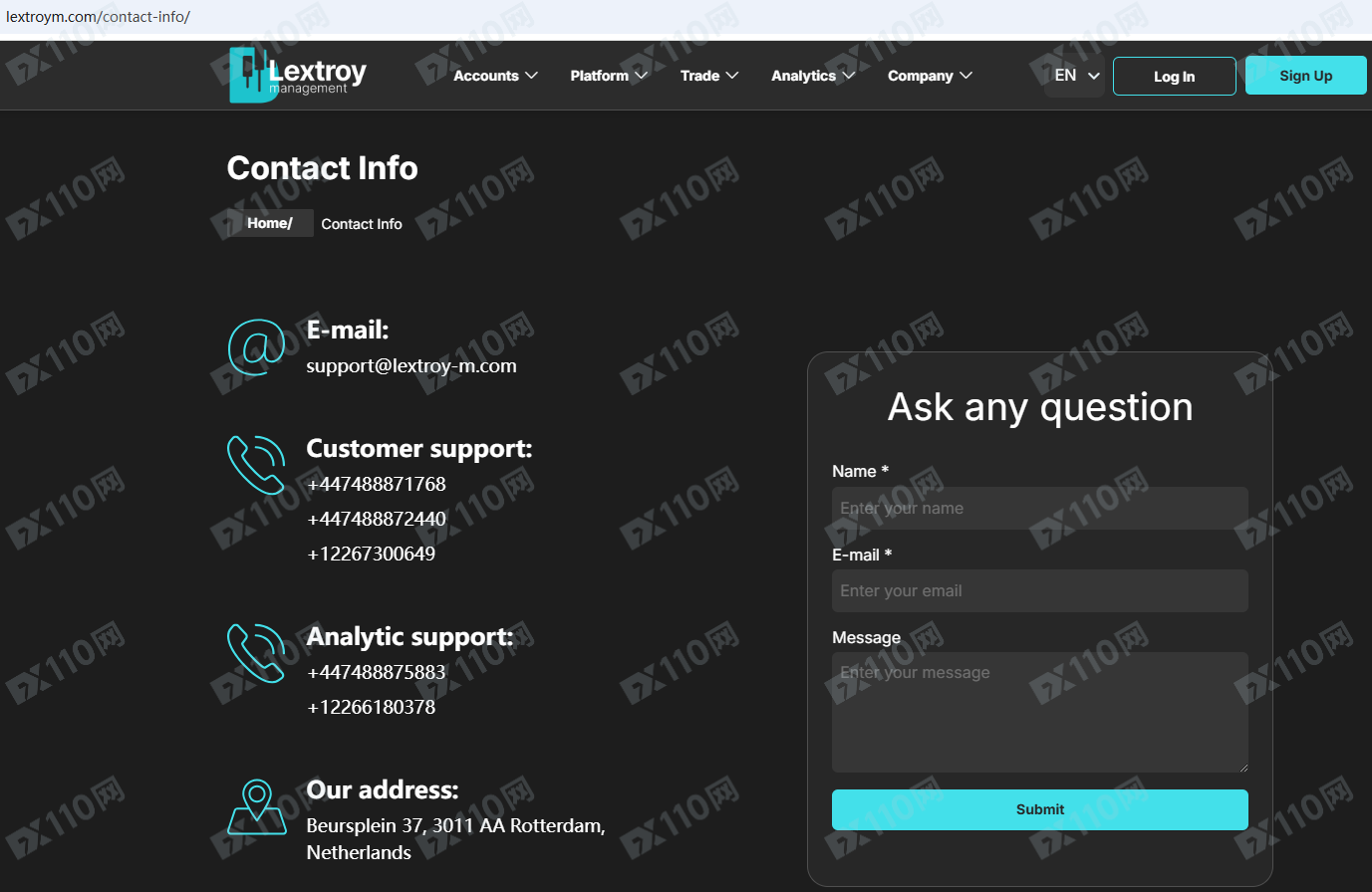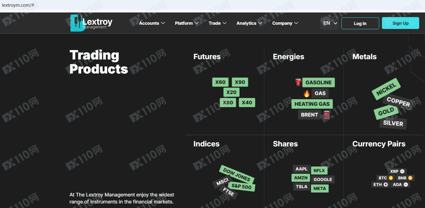 Lextroy Management平臺宣傳位于荷蘭,提供期貨、能源、貴金屬、指數、股票、外匯等金融衍生品投資交易服務,但并未公布其金融服務牌照以便核實。