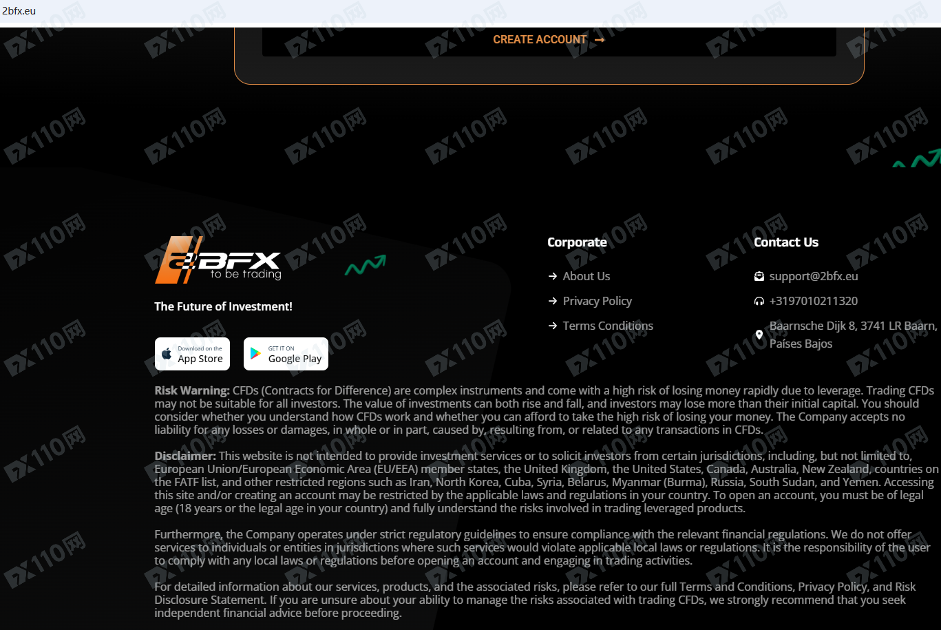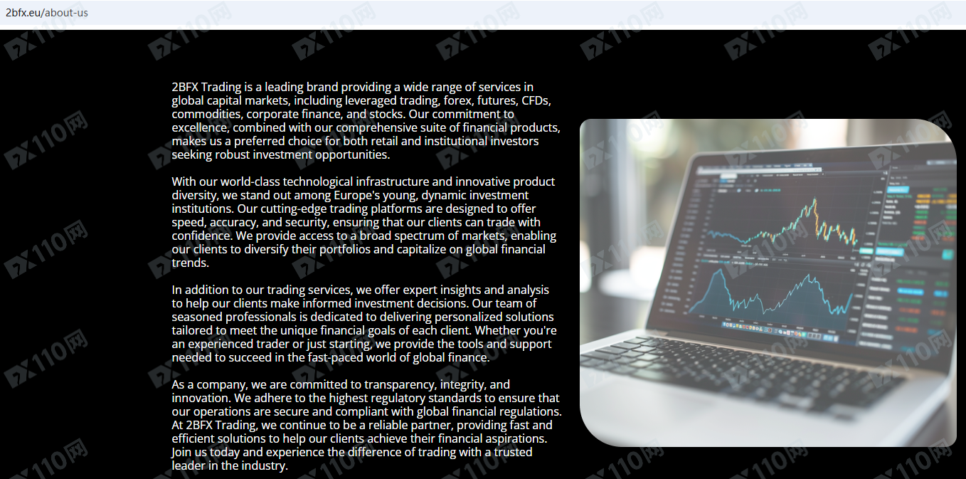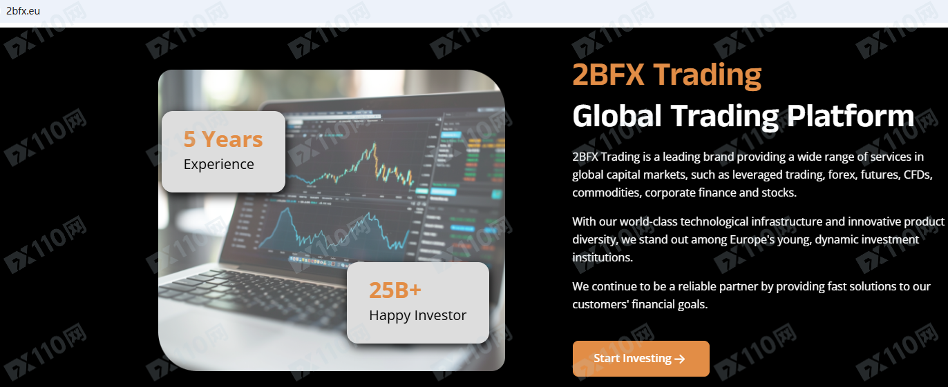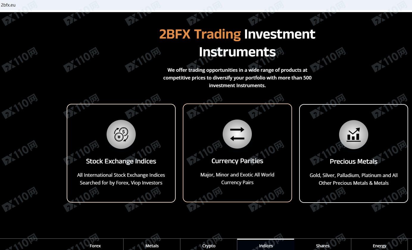 2BFX Trading平臺宣傳位于荷蘭,在全球資本市場提供金融服務,包括外匯、貴金屬、加密貨幣、指數、股票、能源等衍生品投資服務,但并未公布其金融服務牌照以便核實。