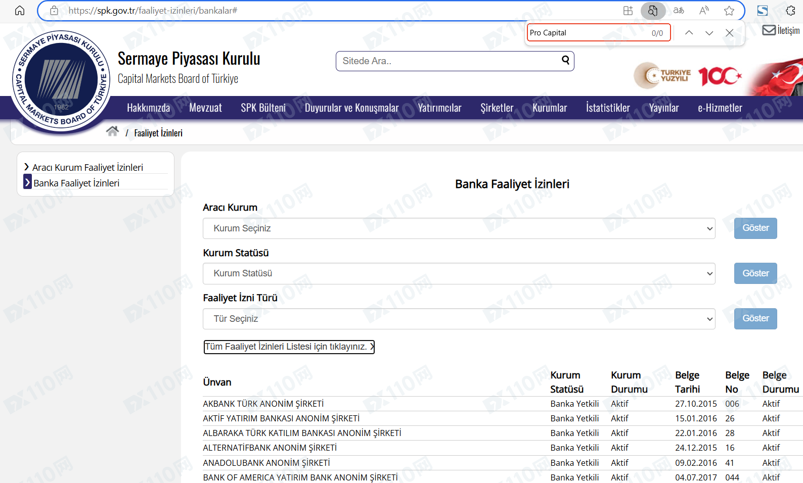 我們在土耳其資本市場委員會(CMB)也查無符合Pro Capital的公司名稱,確認是無監管的平臺,請勿入金交易。