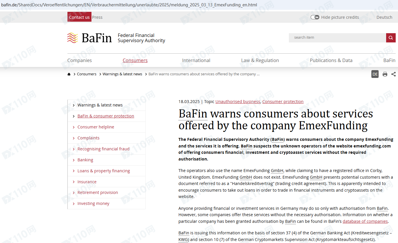該平臺因未經授權許可提供金融產品服務,已被德國BaFin列入警示黑名單,請遠離!