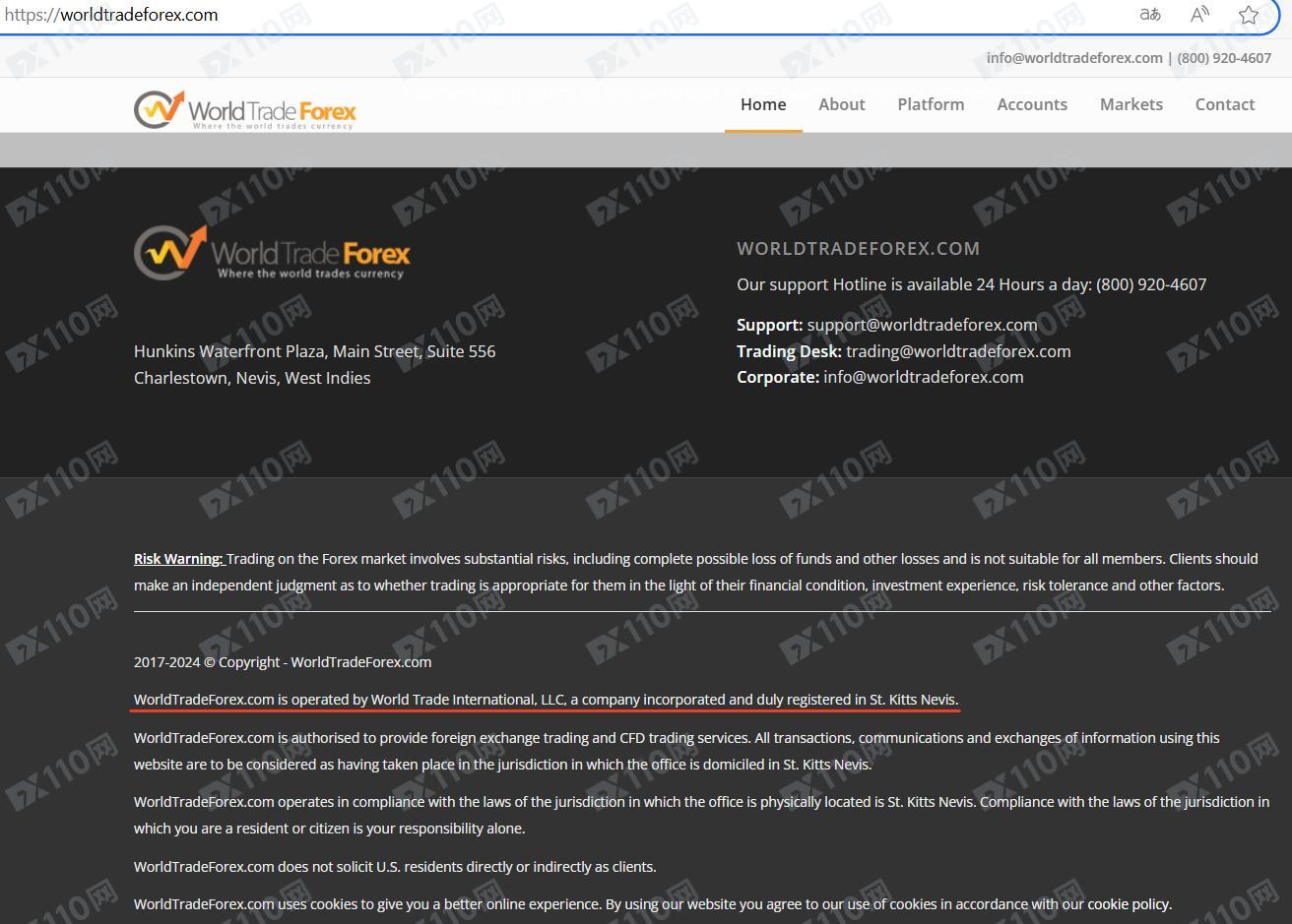 該平臺宣稱由World Trade International, LLC運營,公司注冊于圣基茨和尼維斯, 授權提供外匯交易和差價合約交易服務。