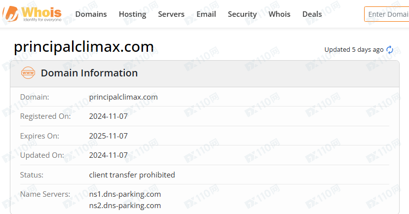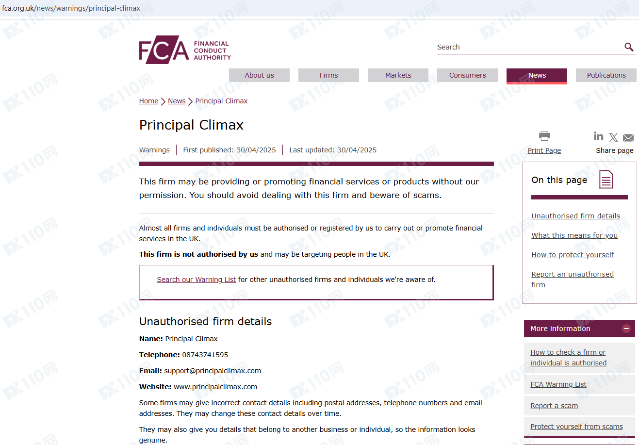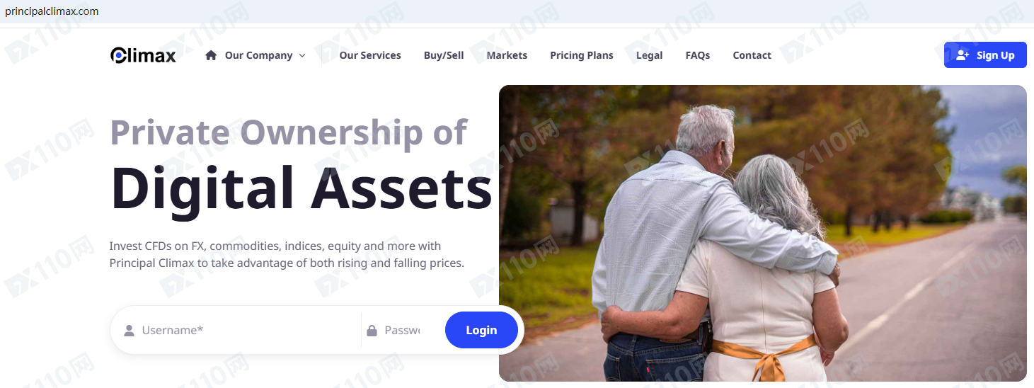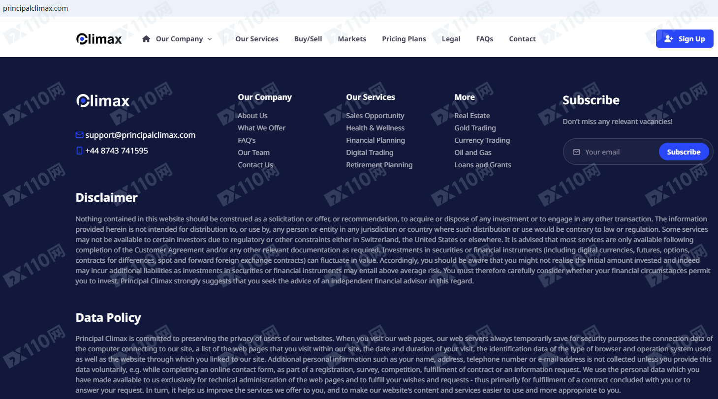 Principal Climax平臺宣傳提供外匯、大宗商品、指數、股票等金融衍生品投資服務,但并未公布其經營地址和金融服務牌照以便核實。