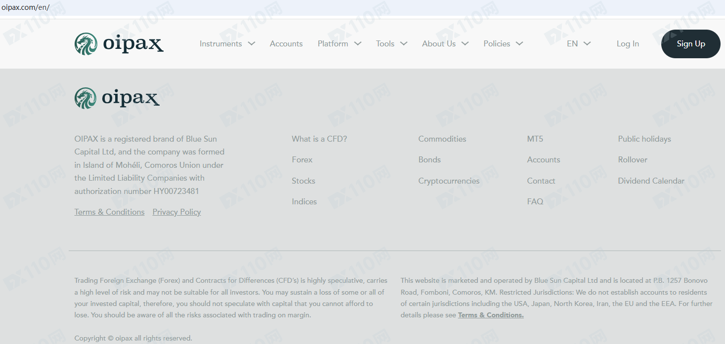 Oipax平臺宣傳是Blue Sun Capital Ltd的注冊品牌,公司在科摩羅聯盟莫埃利島成立,提供外匯、股票、指數、大宗商品等金融衍生品投資服務。
