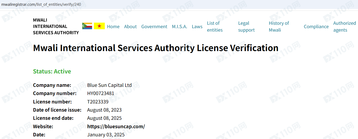 經查詢,莫埃利國際服務管理局MISA的經紀商公司列表中確實有一家Blue Sun Capital Ltd,但登記網址為https://bluesuncap.com,信息不一致,顯然Oipax是套牌冒充!