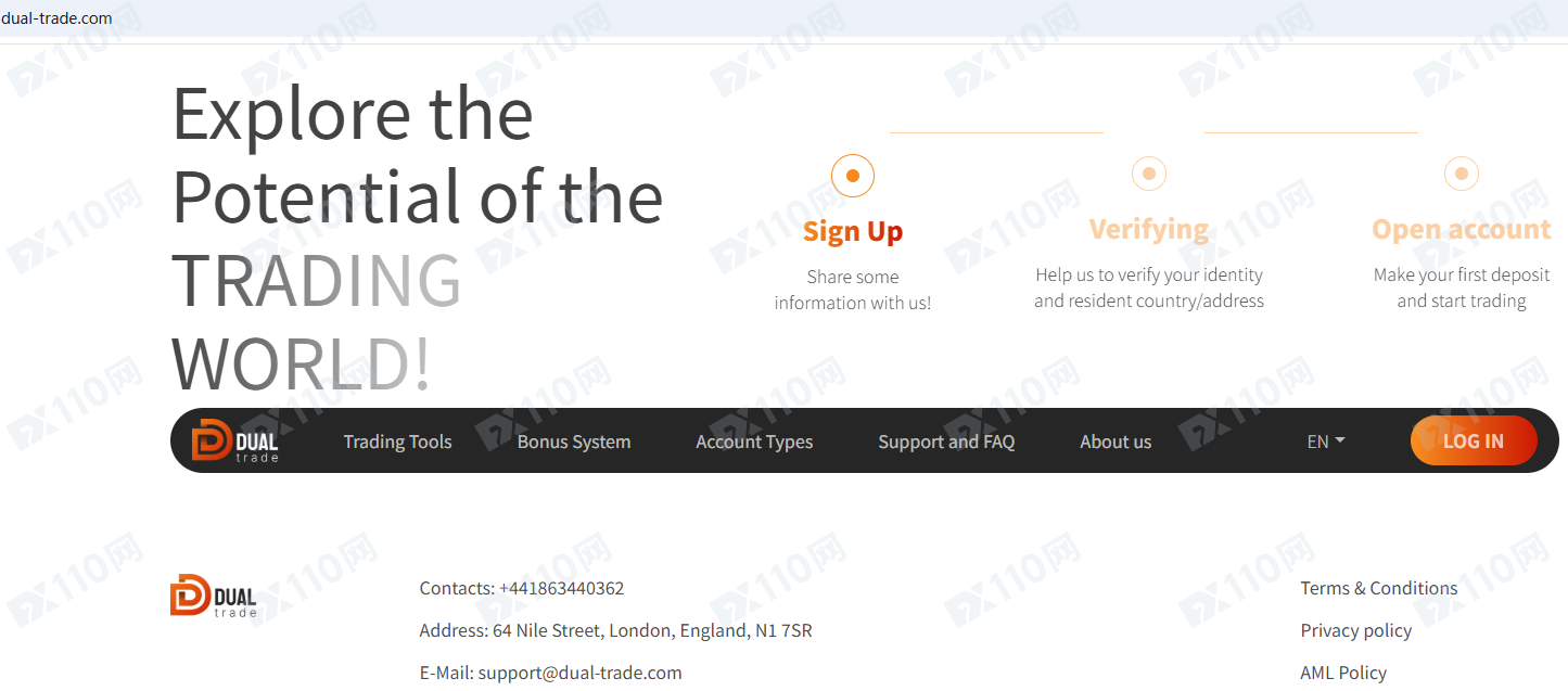 Dual Trade宣傳是一家位于英國的交易平臺,但并未公布其詳細的金融服務牌照信息以便核實。