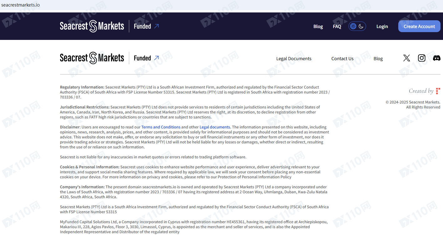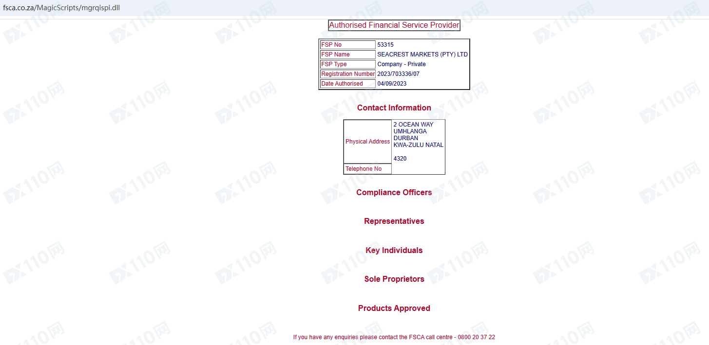 經查詢,在南非FSCA確實有查詢到一家SEACREST MARKETS (PTY) LTD,但未登記網址!