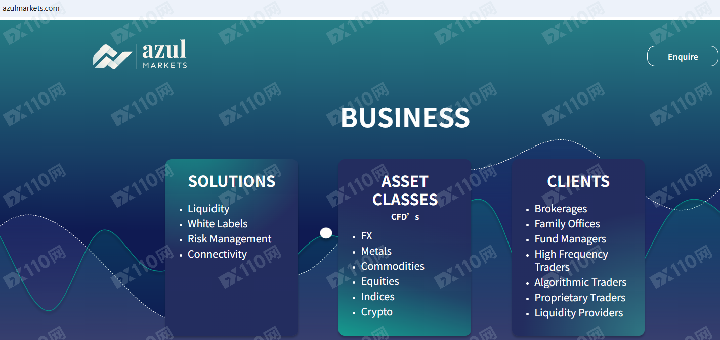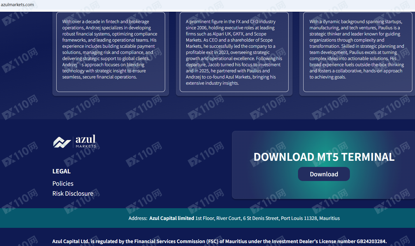 Azul Markets平臺宣傳所屬Azul Capital Ltd,受毛里求斯金融服務委員會FSC的監管,提供外匯、貴金屬、大宗商品、股票、指數、加密貨幣等金融衍生品投資服務。