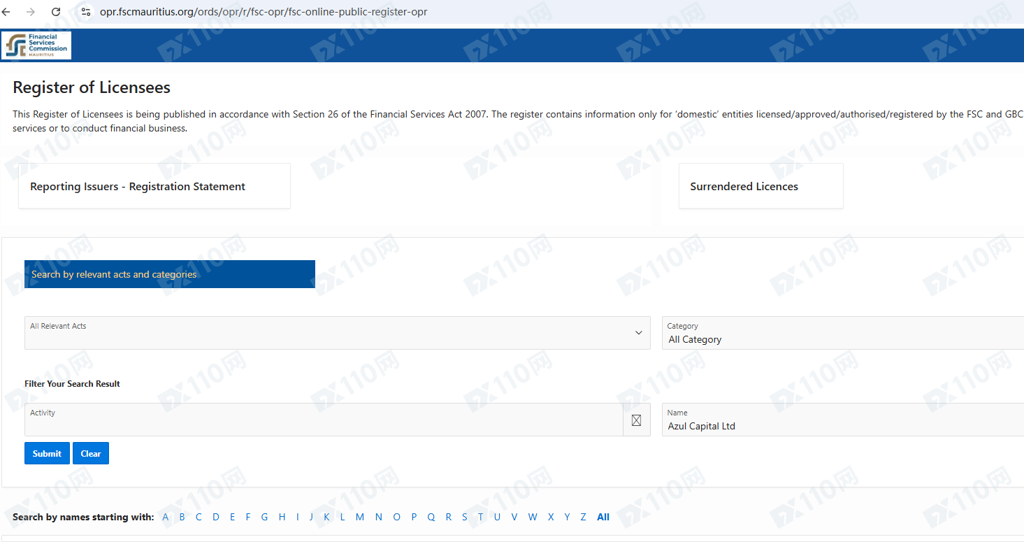 經查詢,毛里求斯FSC并無Azul Capital Ltd的登記,顯然無監管。