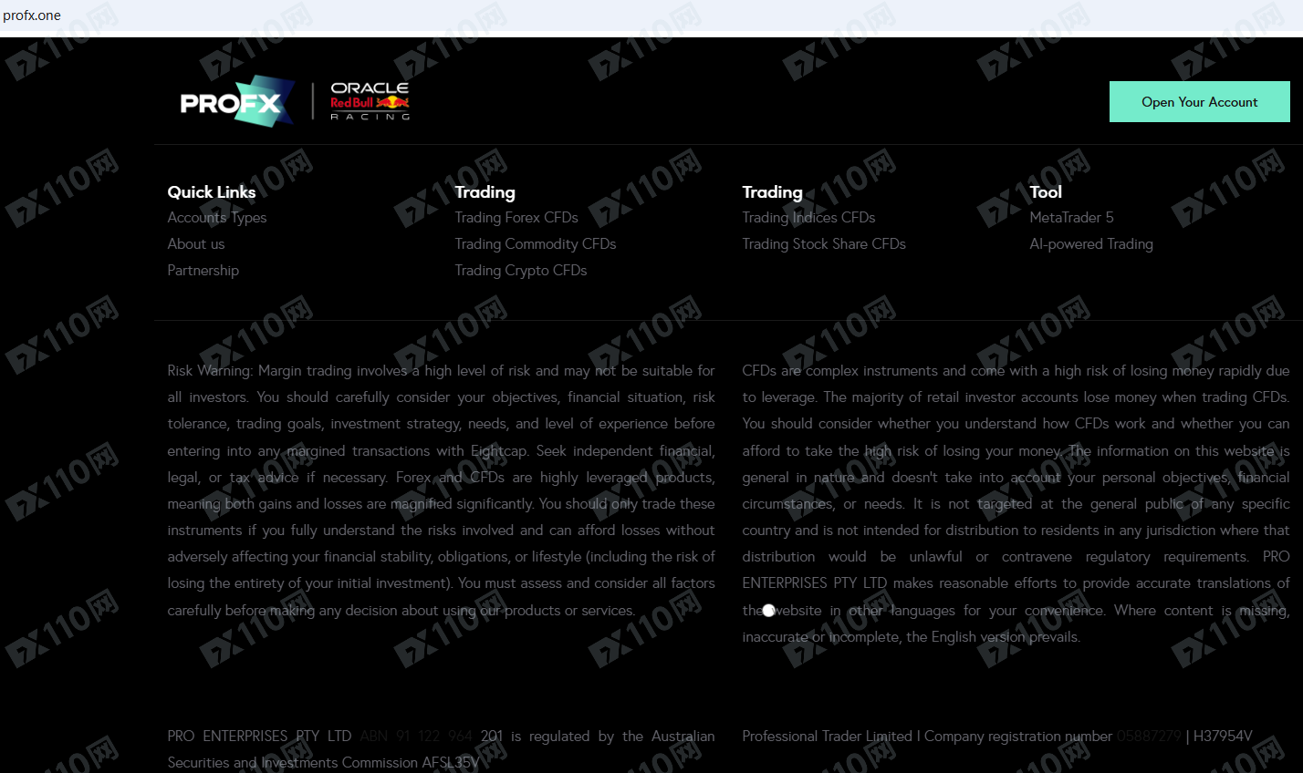 ProFX One平臺宣傳位于英國和澳大利亞,PRO ENTERPRISES PTY LTD受澳大利亞ASIC的監管,提供外匯、大宗商品、加密貨幣、指數、股票等金融衍生品投資服務。