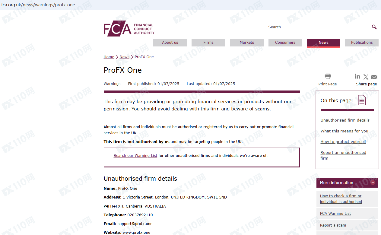 因未經授權許可提供金融產品服務,ProFX One已被英國FCA列入警示黑名單,請遠離!