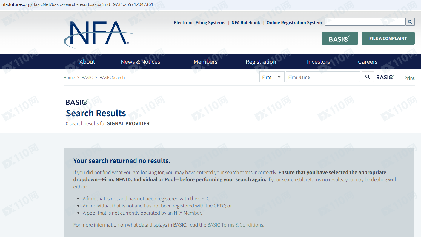 經查詢,在美國NFA沒有查詢到Signal Provider Pty Ltd的登記,顯然不受監管。