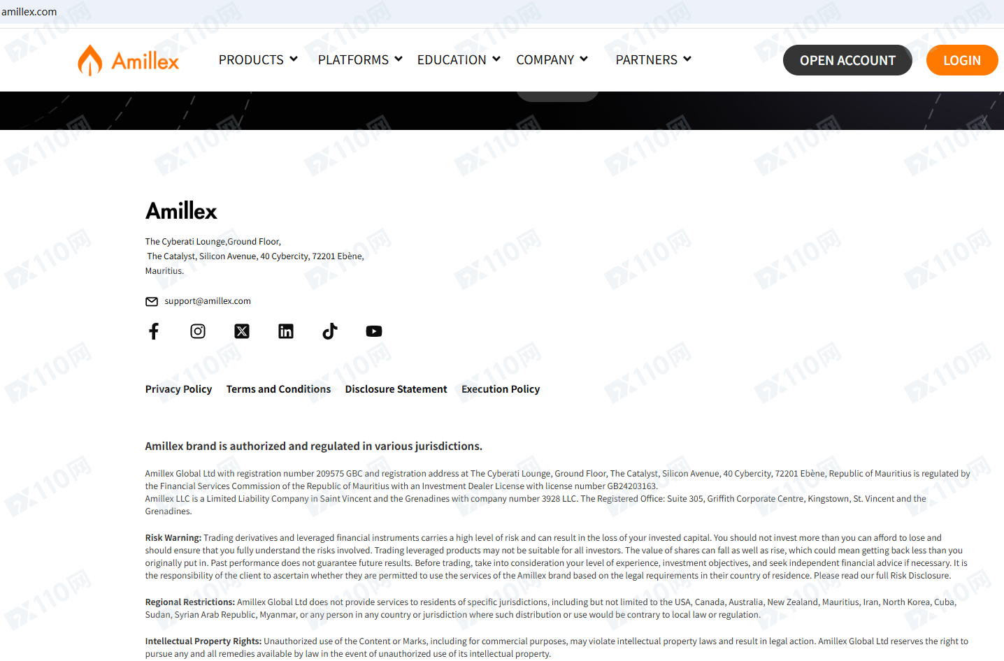 Amillex平臺宣傳Amillex Global Ltd注冊于毛里求斯,受毛里求斯FSC的監管,持有投資交易商許可證,許可證號為 GB24203163;Amillex LLC是圣文森特和格林納丁斯的一家有限責任公司,公司編號為3928 LLC,提供外匯、貴金屬、能源、大宗商品、股票、指數、加密貨幣等金融衍生品投資服務。
