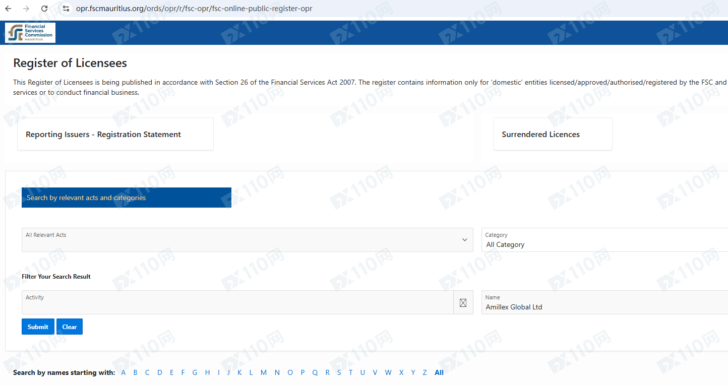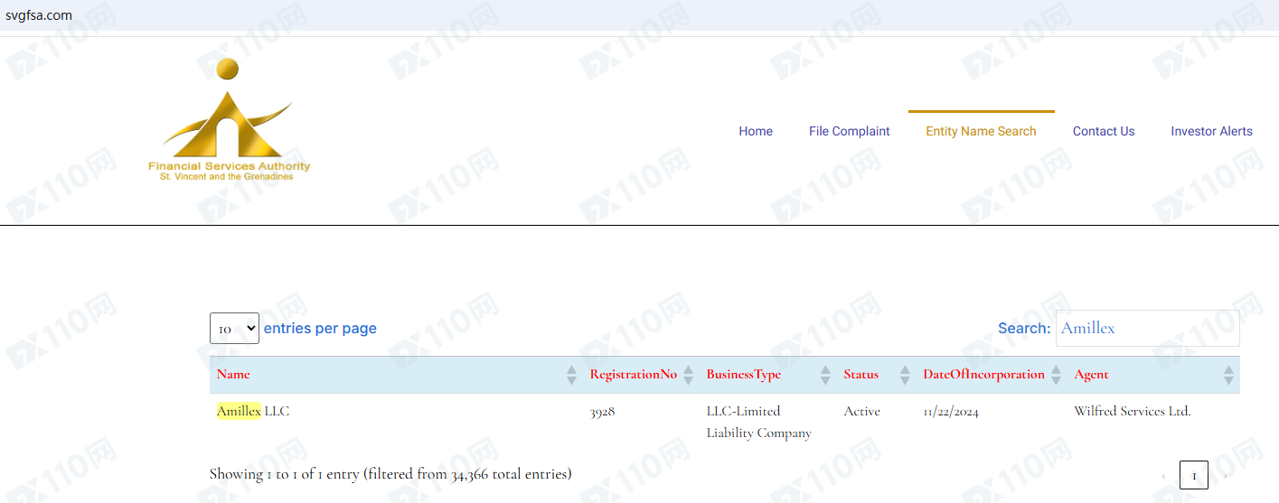 經查詢,在毛里求斯FSC沒有查詢到相關登記,顯然不受監管。在圣文森特FSA有查詢到Amillex LLC的登記,但請注意,圣文森特FSA機構不監管金融衍生品經紀商的業務。