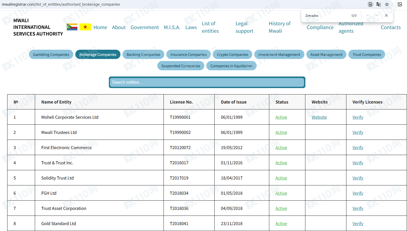 Zetradex平臺宣傳位于科摩羅,受莫埃利國際服務管理局MISA的監管,公司執照號:T2023278,提供外匯、股票、指數、貴金屬、期貨、加密貨幣等金融衍生品投資交易服務。
