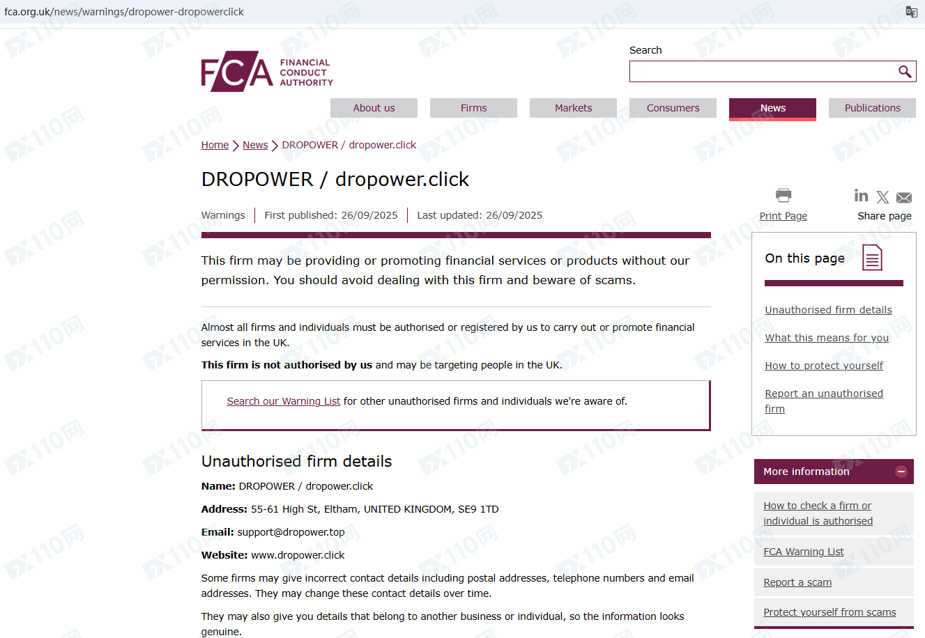 因未經授權許可提供金融產品投資服務,Dropower已被英國FCA列入警示黑名單,請遠離!