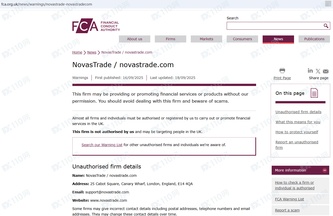 因未經授權許可提供金融產品投資服務,NovasTrade已被英國FCA列入警示黑名單,請遠離!