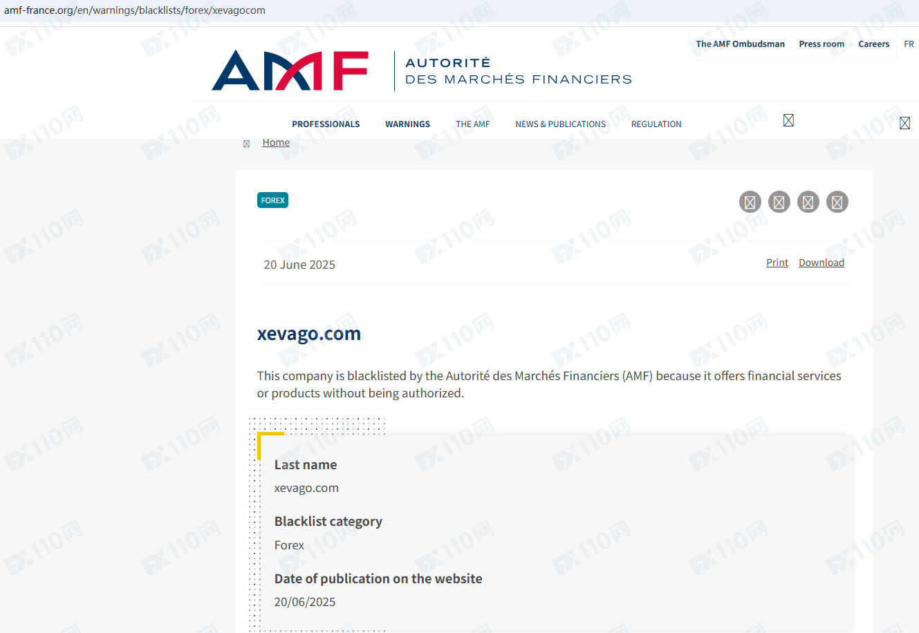因未經授權許可提供金融產品投資服務,Xevago已被法國AMF列入警示黑名單,請遠離!