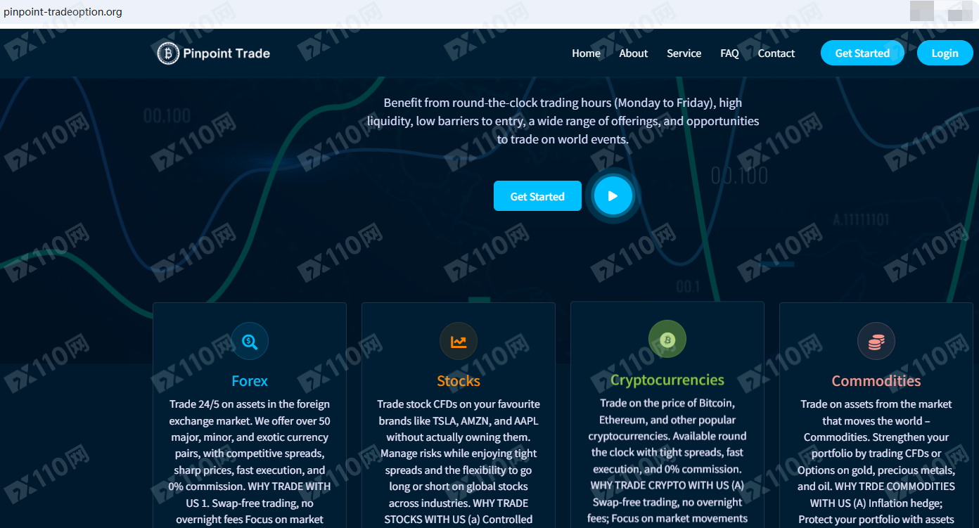 Pinpoint Trade平臺宣傳位于美國,提供外匯、股票、加密貨幣、大宗商品等金融衍生品投資交易服務。