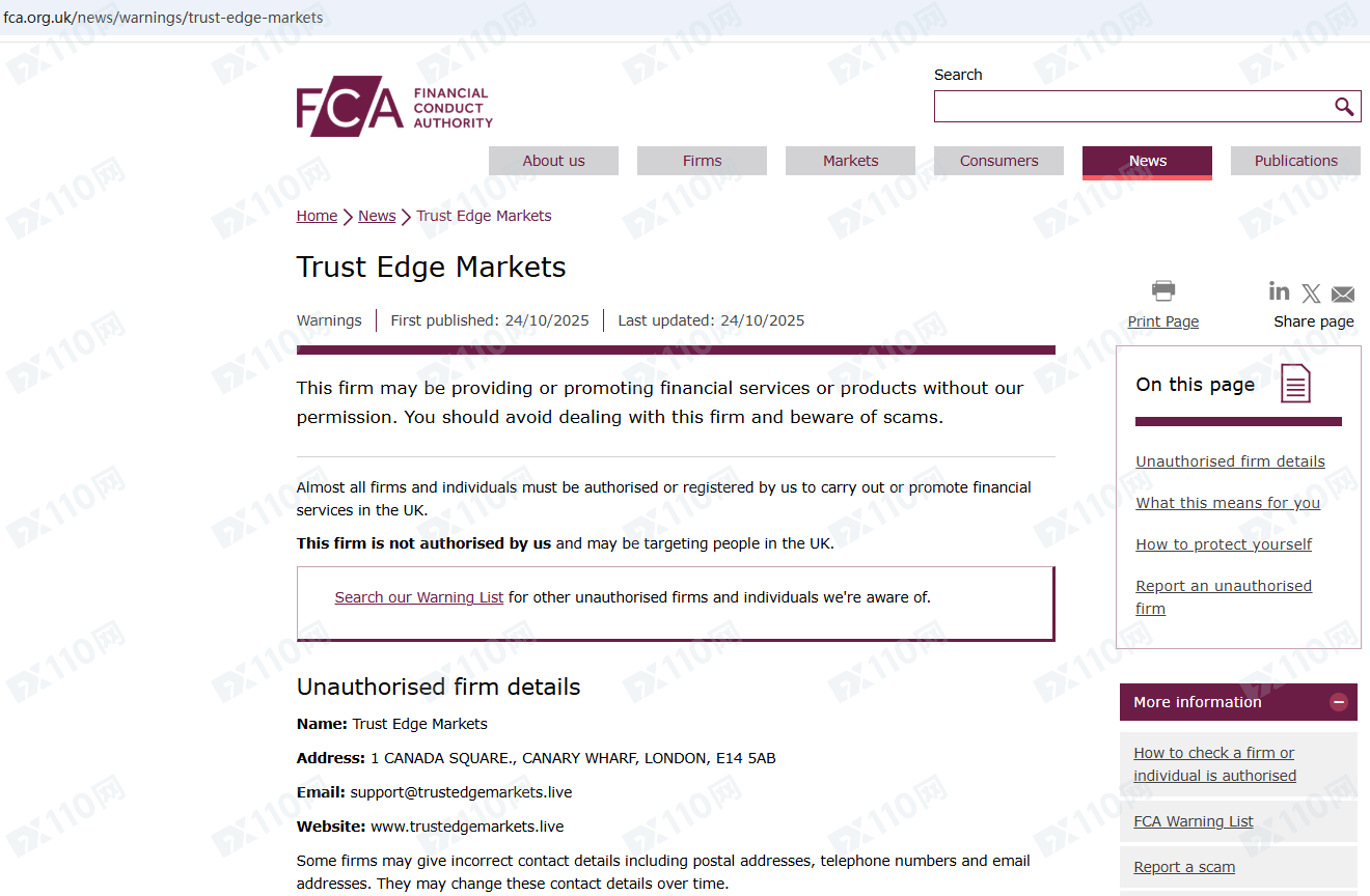 因未經授權許可提供金融產品投資服務,Trust Edge Markets已被英國FCA列入警示黑名單,請遠離!