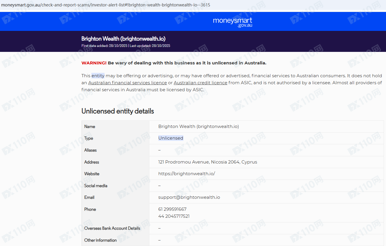 因未經授權許可提供金融產品投資服務,Brighton Wealth已被澳大利亞列入警示黑名單,請遠離!