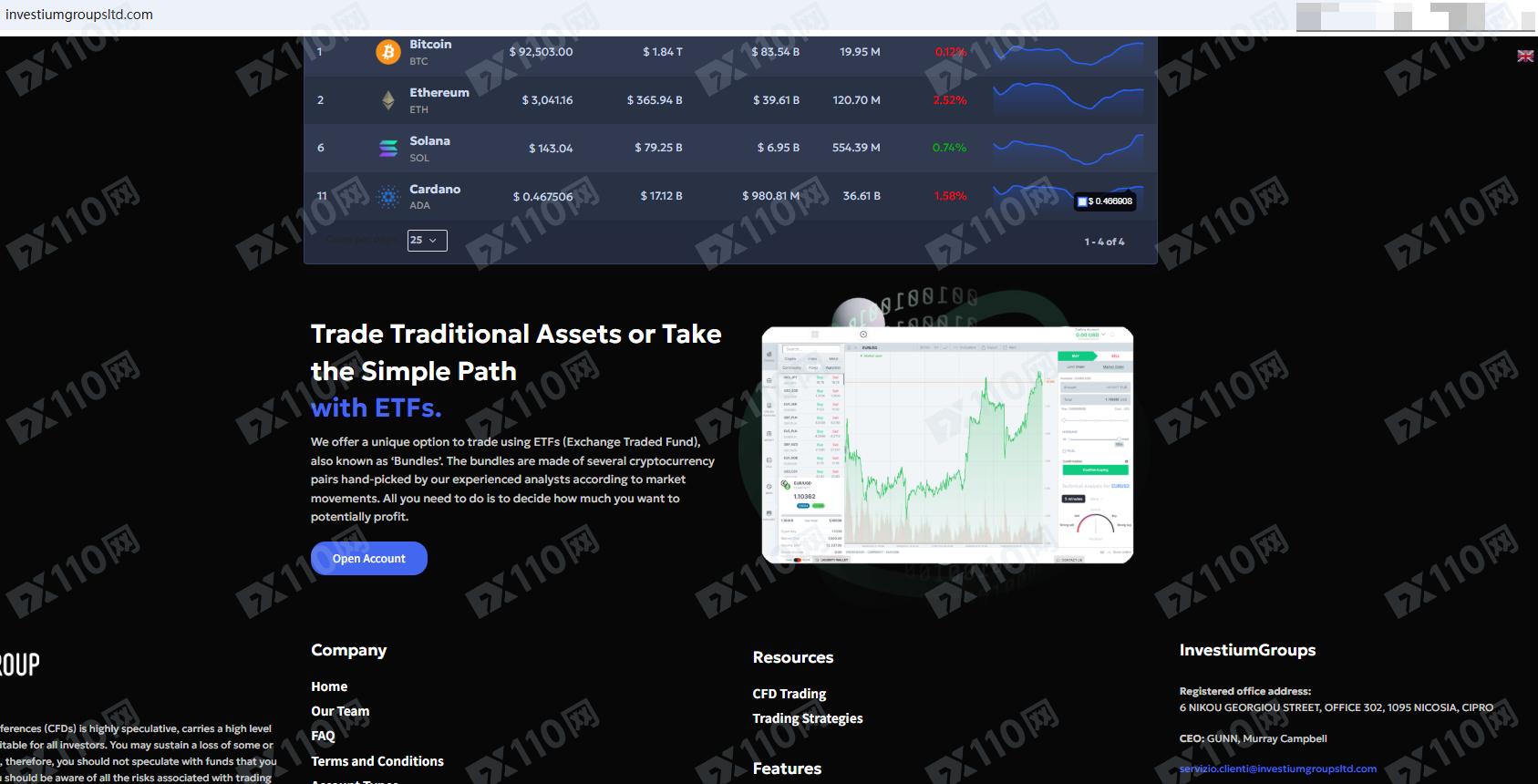 InvestiumGroups平臺宣傳位于塞浦路斯,提供外匯、指數、大宗商品、加密貨幣等金融衍生品投資交易服務,但并未公布其金融服務牌照以便核實。