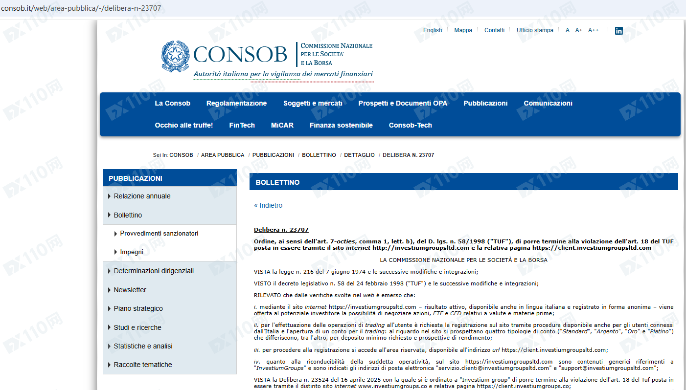 因未經授權許可提供金融產品投資服務,InvestiumGroups已被意大利CONSOB列入警示黑名單,請遠離!