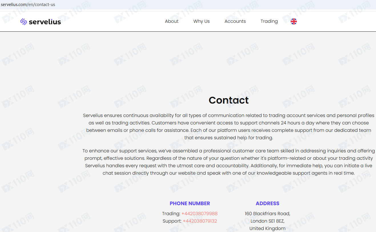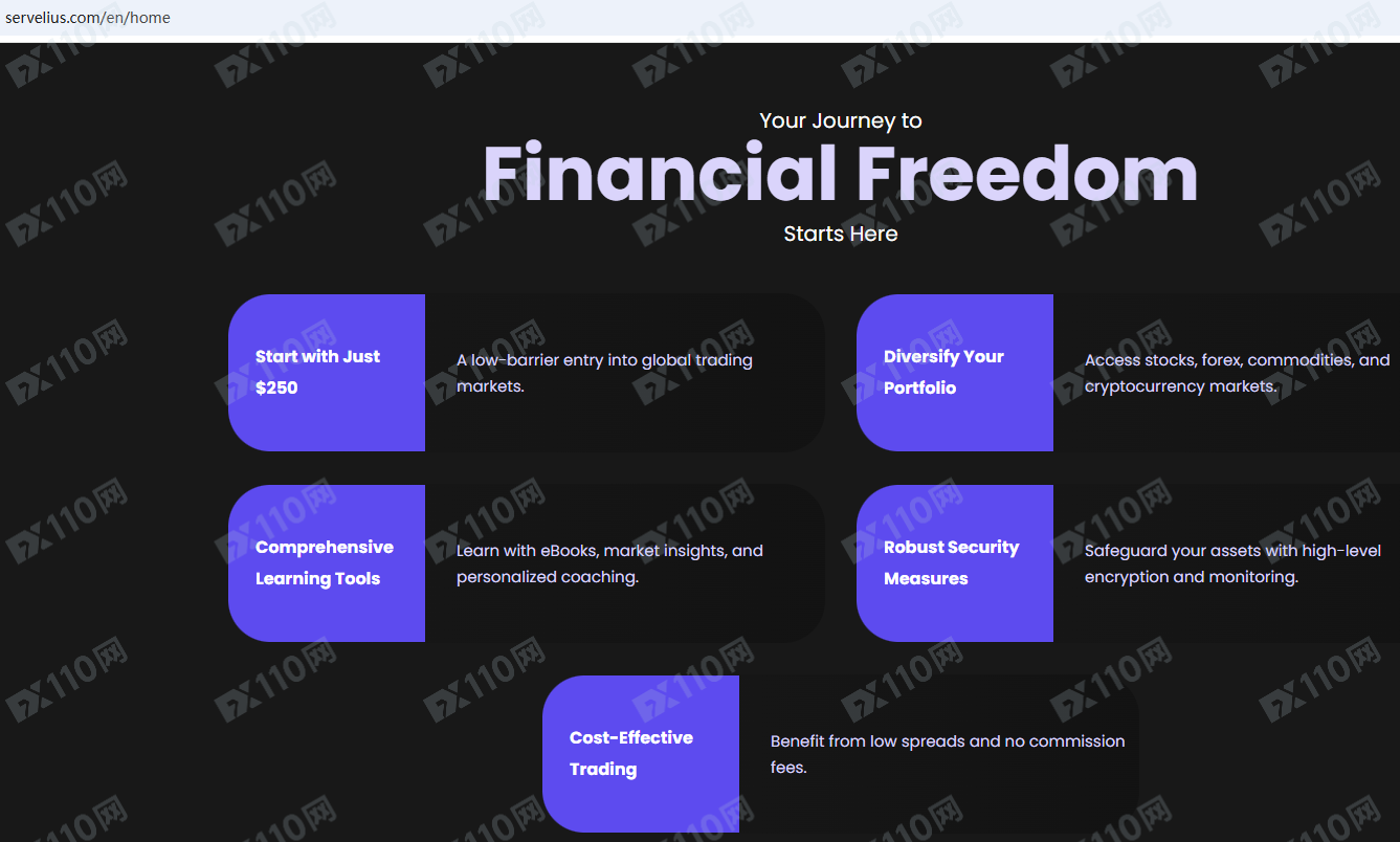Servelius平臺宣傳位于英國,提供股票、外匯、大宗商品、加密貨幣等金融衍生品投資交易服務,但并未公布其金融服務牌照以便核實。