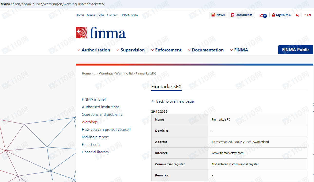因未經授權許可提供金融產品投資服務,FinMarkets FX已被瑞士FINMA列入警示黑名單,請遠離!
