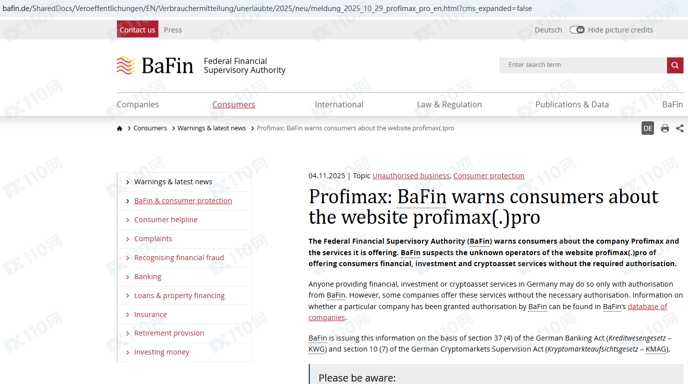 因未經授權許可提供金融產品投資服務,Profimax已被德國BaFin列入警示黑名單,請遠離!