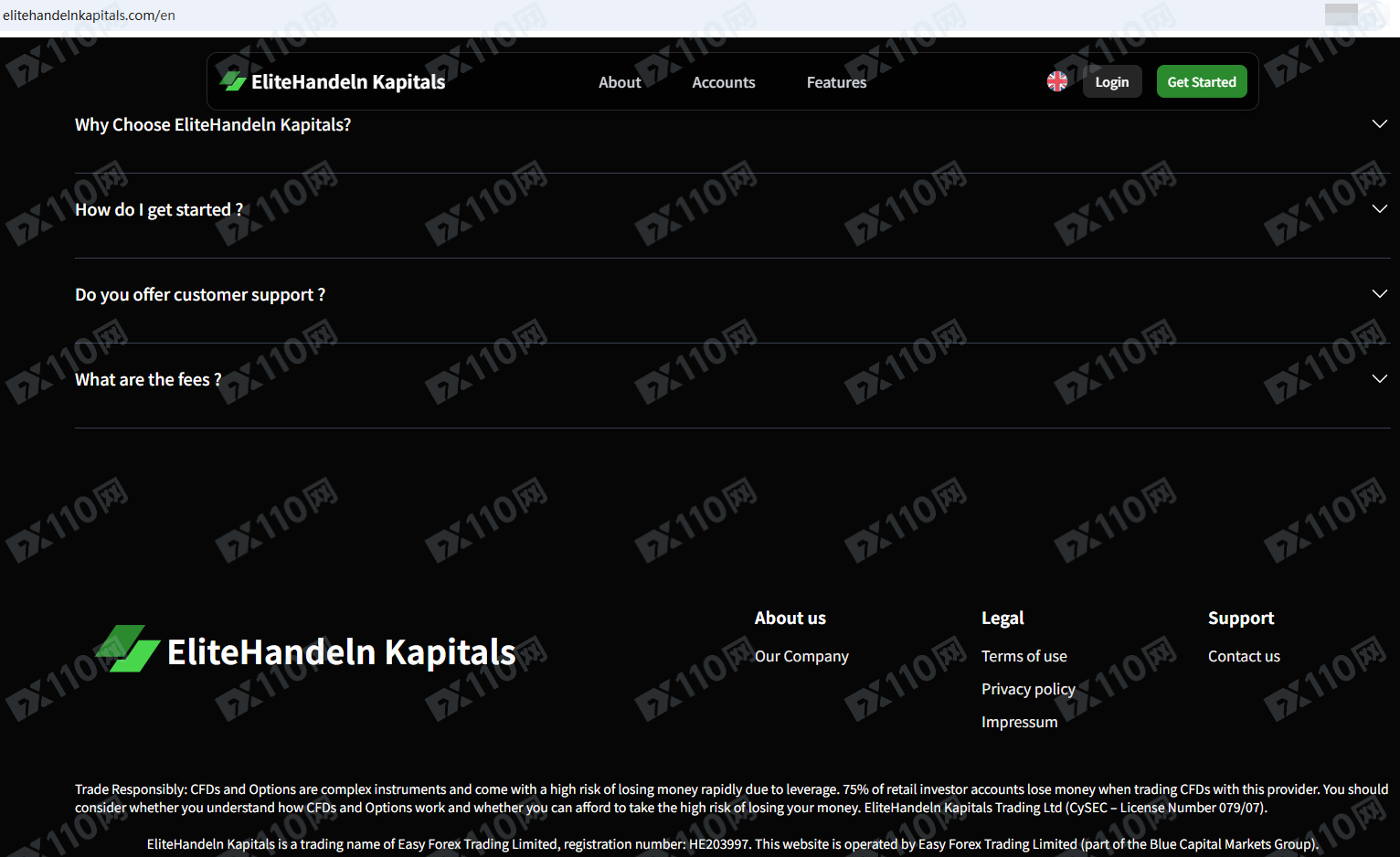 EliteHandeln Kapitals平臺宣傳是Easy Forex Trading Limited的交易名稱,受塞浦路斯CySEC的監管,許可證號079/07,提供外匯、加密貨幣、大宗商品、指數等金融衍生品投資交易服務。