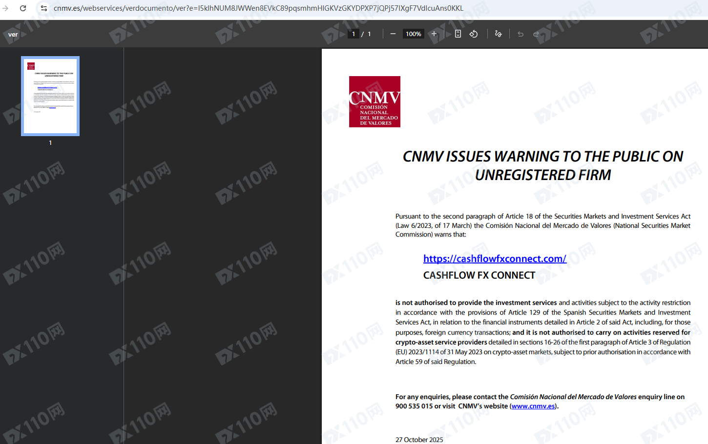 因未經授權許可提供金融產品投資服務,Cashflow FX Connect已被西班牙CNMV列入警示黑名單,請遠離!