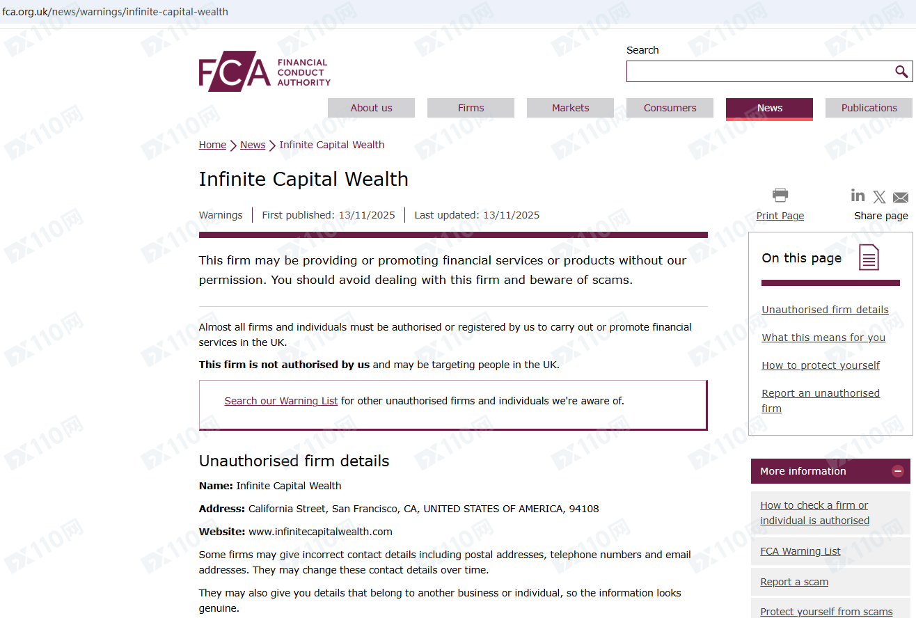 因未經授權許可提供金融產品投資服務,Infinite Capital Wealth已被英國FCA列入警示黑名單,請遠離!
