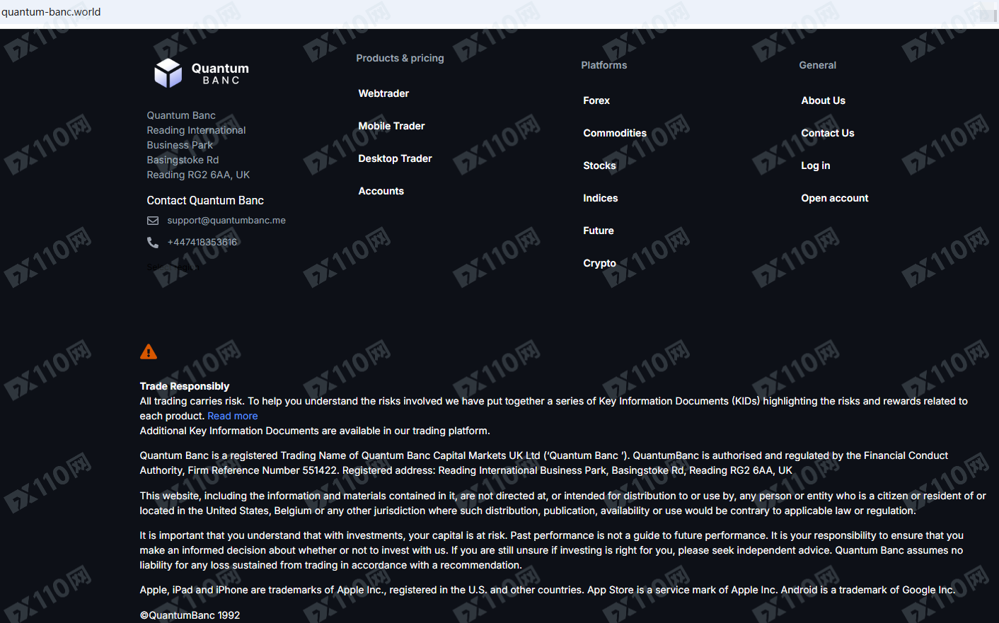 Quantum Banc平臺宣傳位于英國,是Quantum Banc Capital Markets UK Ltd的交易名稱,獲得英國FCA的授權和監管,監管號為551422,提供外匯、大宗商品、股票、指數、加密貨幣等金融衍生品投資交易服務。
