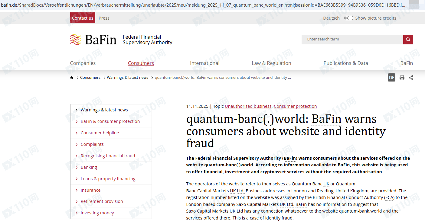 因未經授權許可提供金融產品投資服務,Quantum Banc已被德國BaFin列入警示黑名單,請遠離!