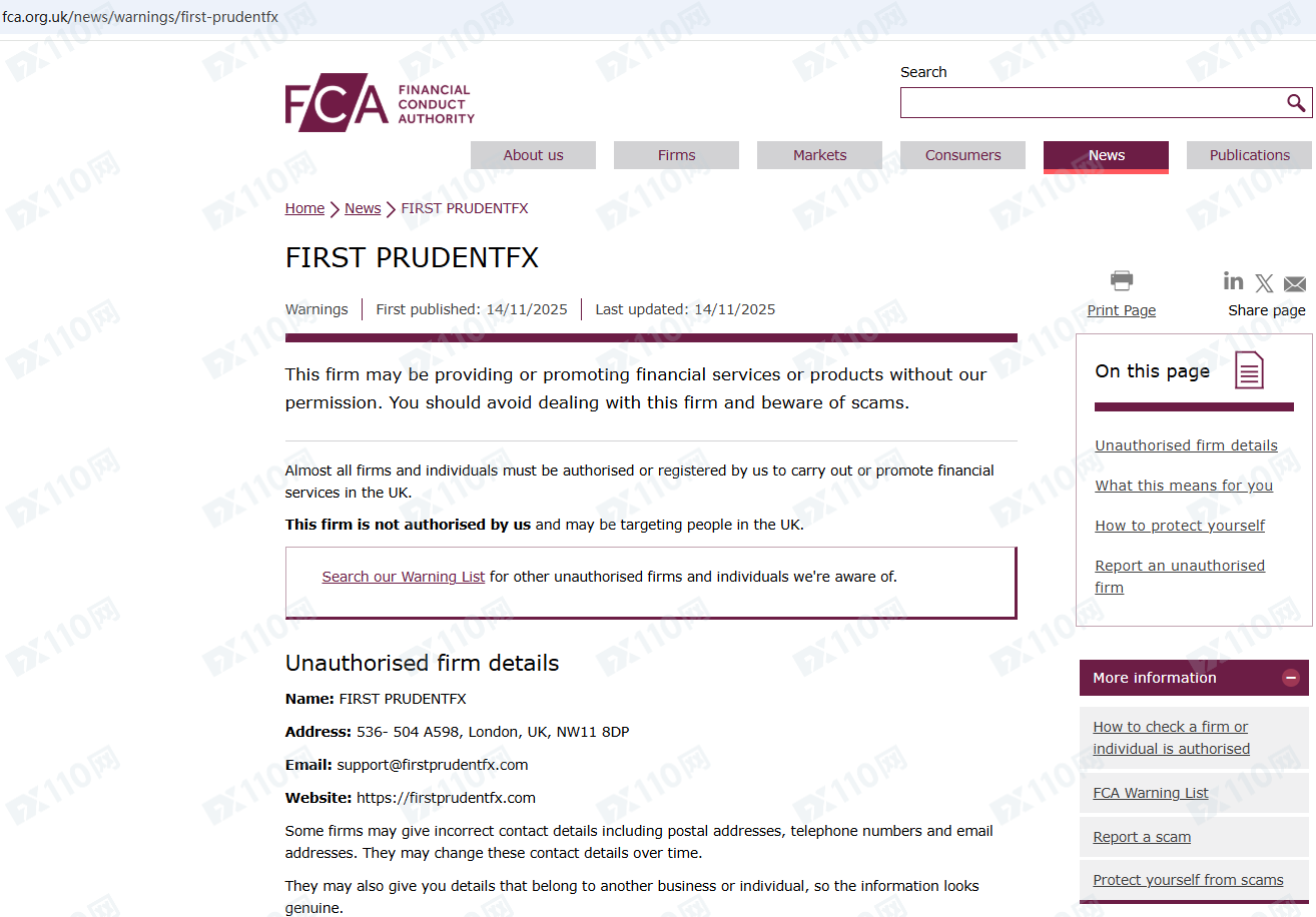 因未經授權許可提供金融產品投資服務,FirstPrudentfx已被英國FCA列入警示黑名單,請遠離!