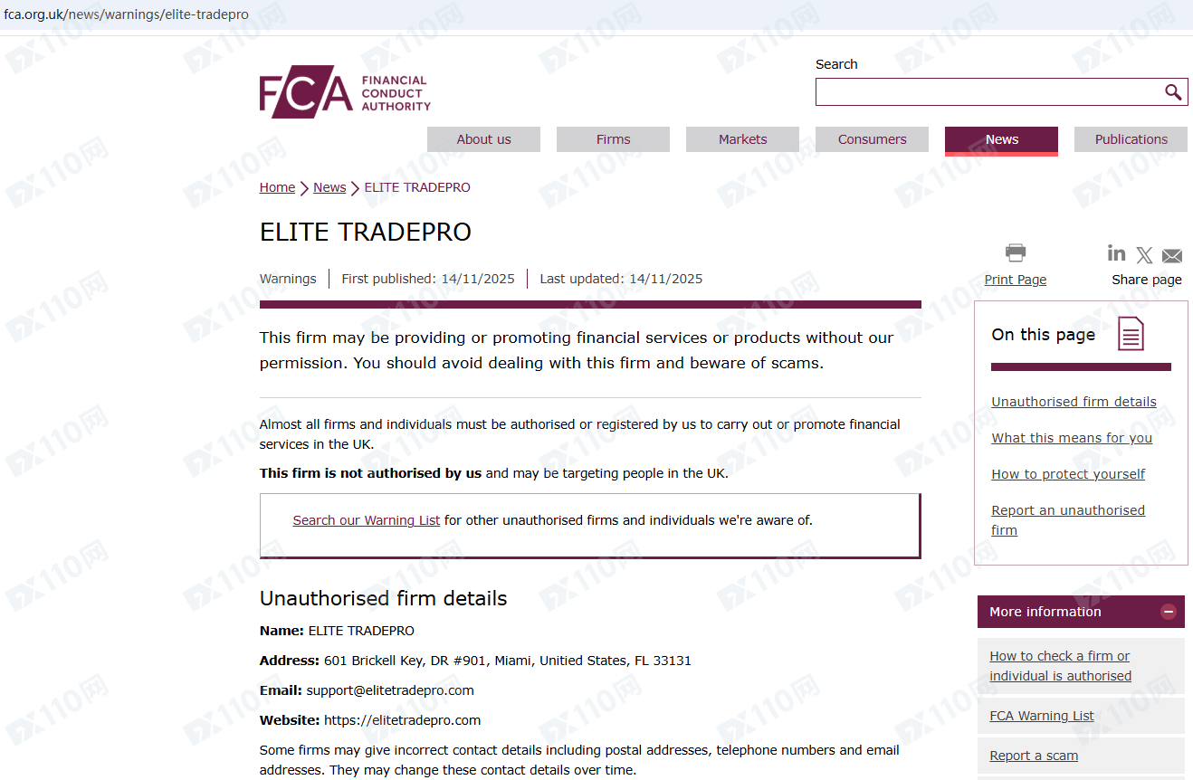 因未經授權許可提供金融產品投資服務,ELITE TRADEPRO已被英國FCA列入警示黑名單,請遠離!