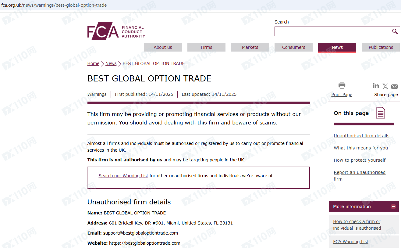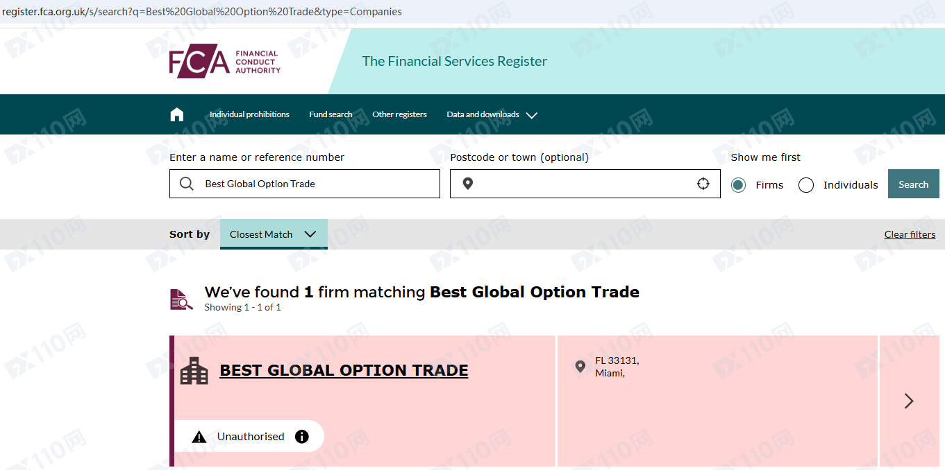因未經授權許可提供金融產品投資服務,Best Global Option Trade已被英國FCA列入警示黑名單,請遠離!