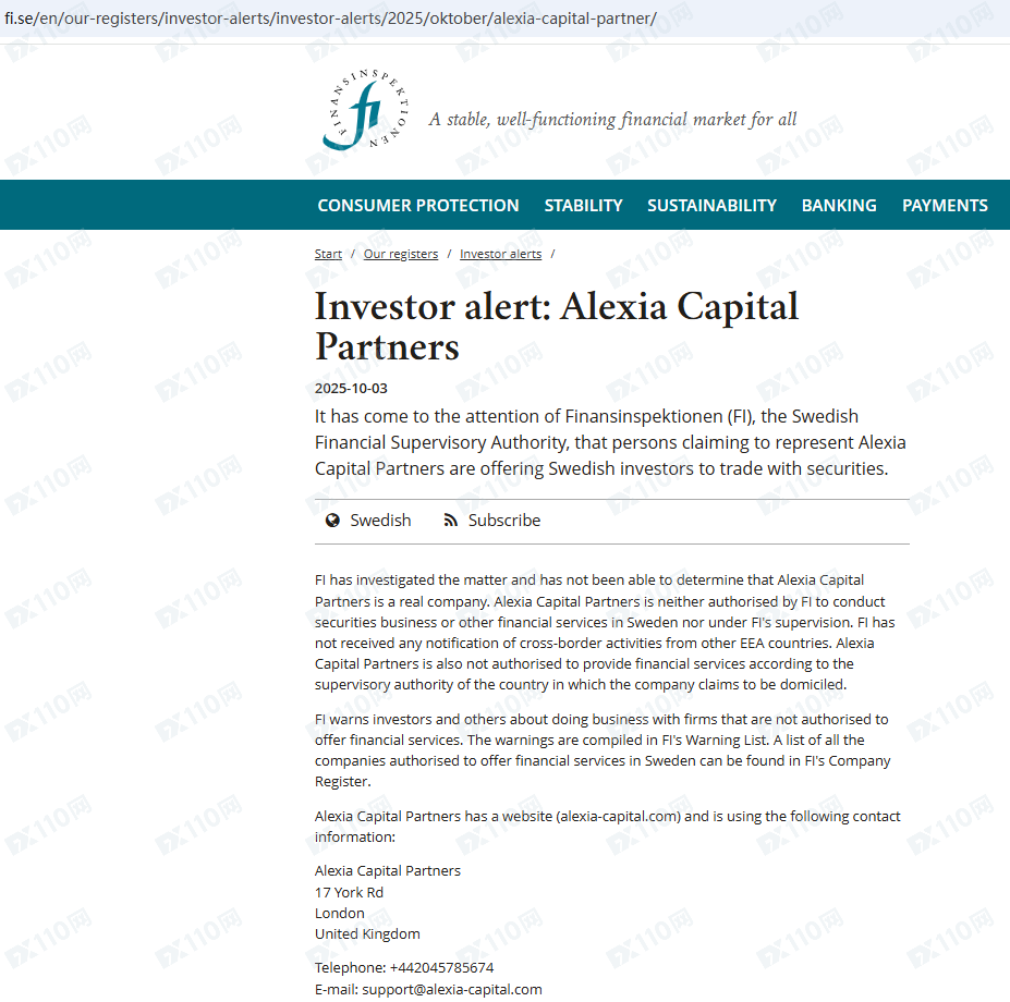 因未經授權許可提供金融產品投資服務,Alexia Capital Partners已被瑞典金融監管局FI列入警示黑名單,請遠離!