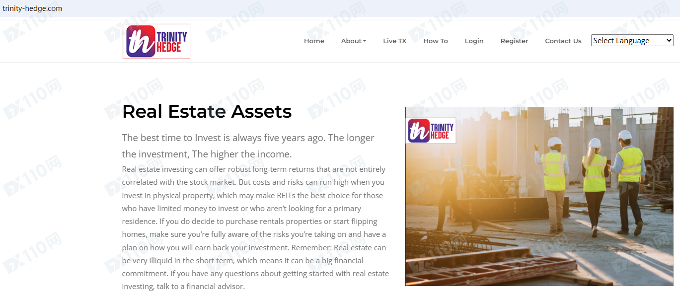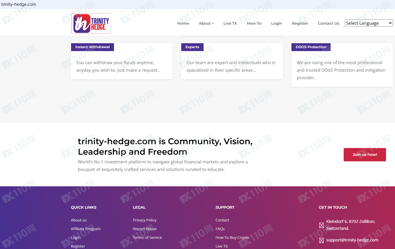 Trinity Hedge平臺宣傳宣傳是一家瑞士的投資公司,提供加密貨幣、房地產投資服務,但并未公布其金融服務牌照以便核實。