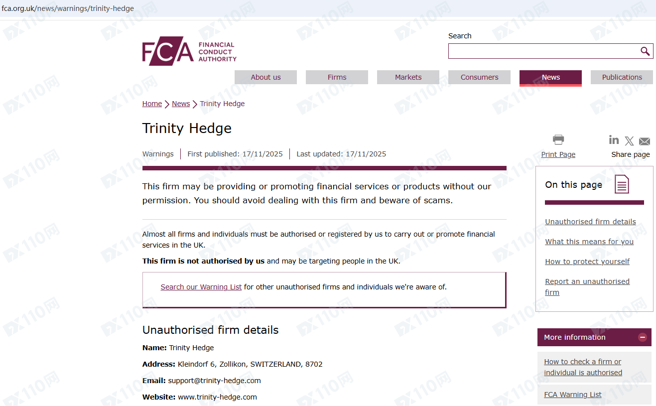 因未經授權許可提供金融產品投資服務,Trinity Hedge已被英國FCA列入警示黑名單,請遠離!