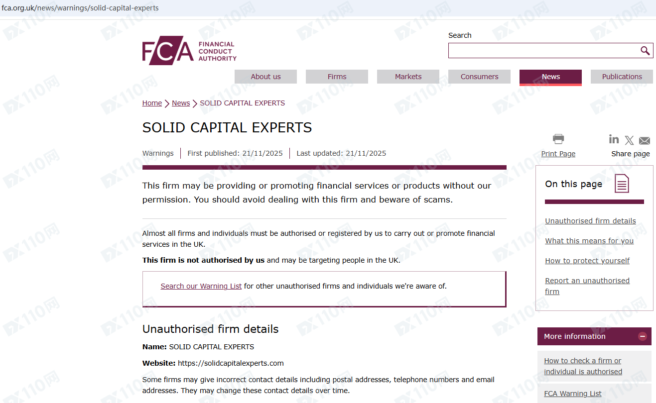 因未經授權許可提供金融產品投資服務,SolidcapitalExperts已被英國FCA列入警示黑名單,請遠離!