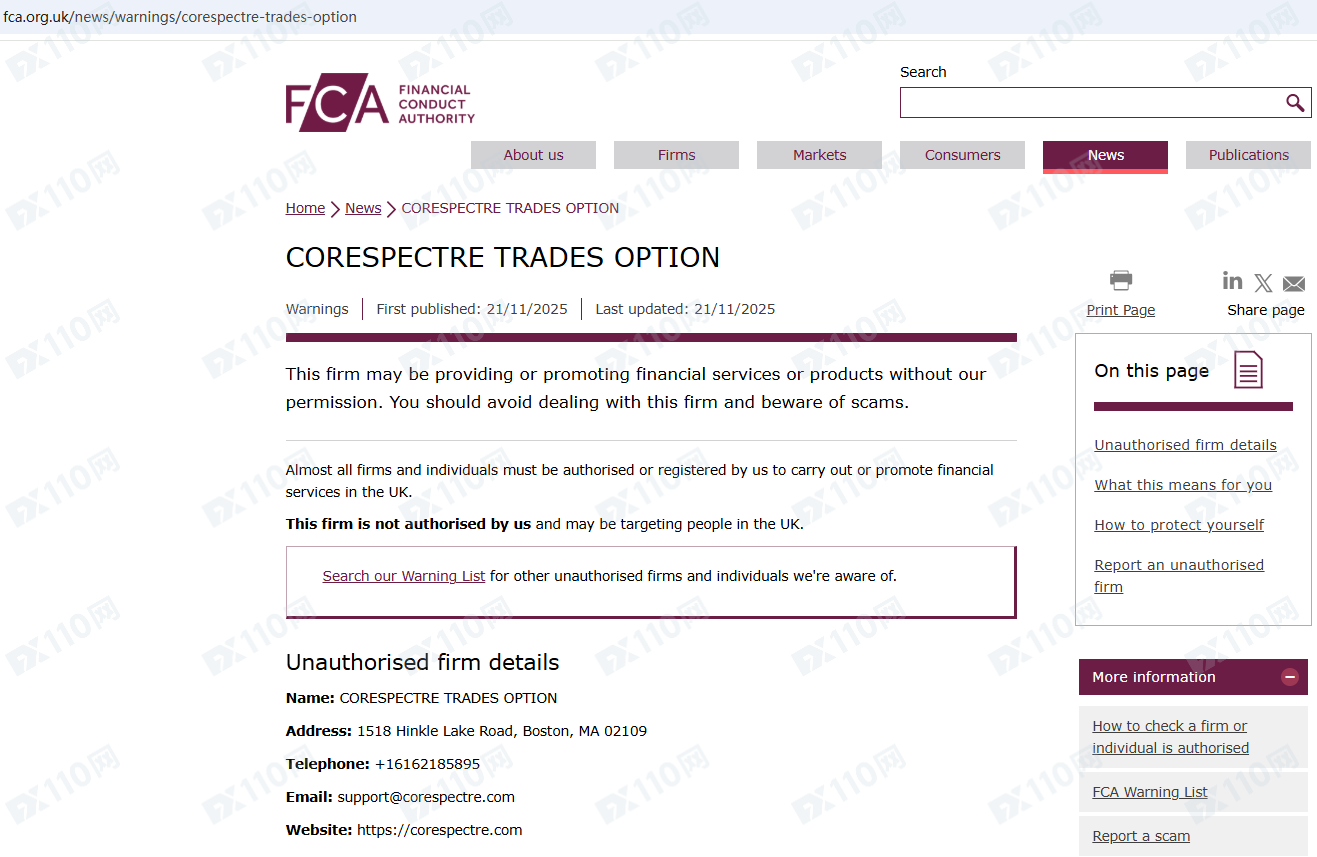 因未經授權許可提供金融產品投資服務,CoreSpectre Trades Option被英國FCA列入警示黑名單,請遠離!