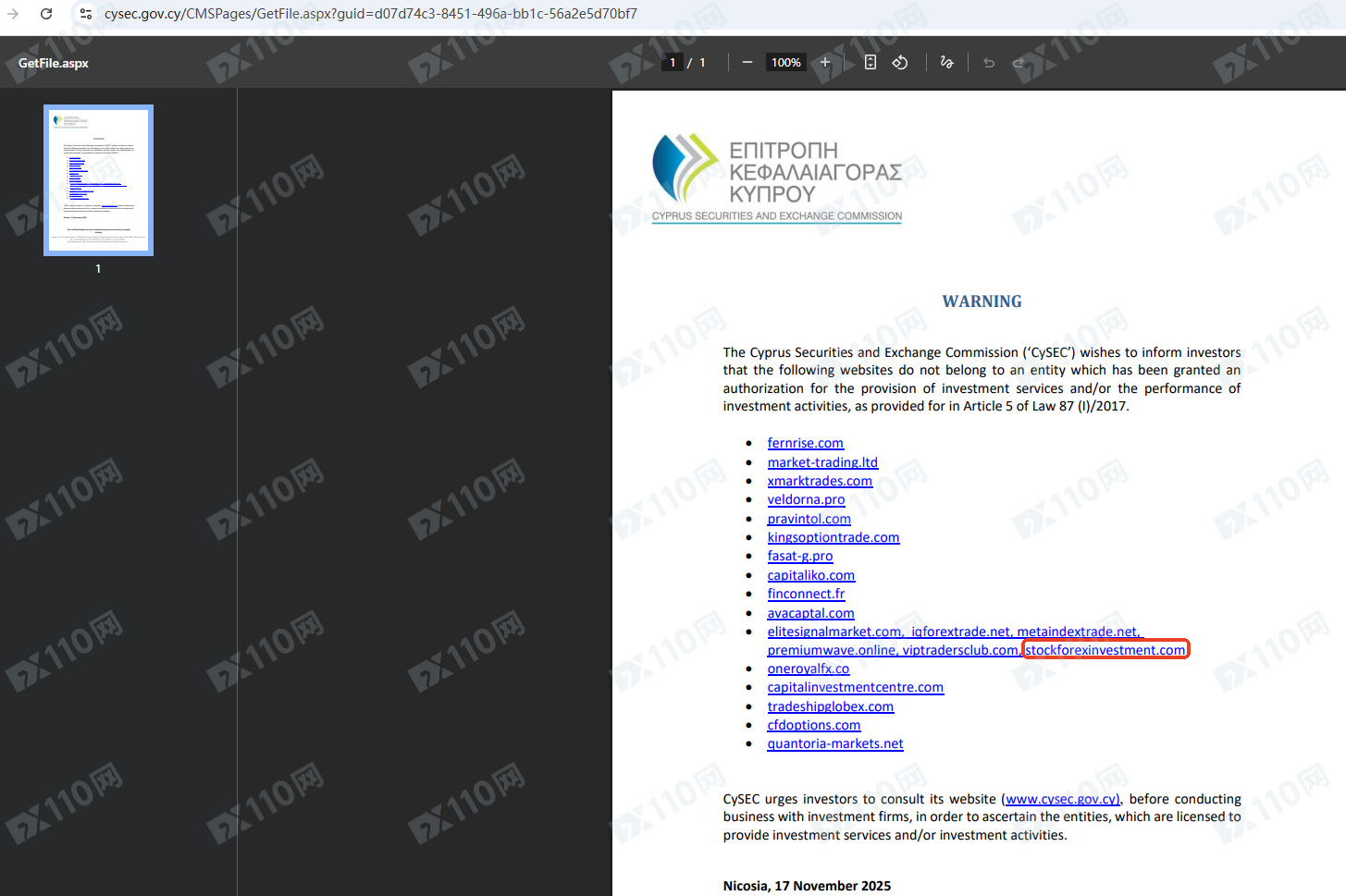 因未經授權許可提供金融產品投資服務,StockForexInvestment已被塞浦路斯證券交易委員會CySEC列入警示黑名單,請遠離!
