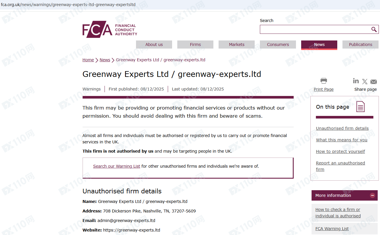因未經授權許可提供金融產品投資服務,Greenway Experts已被英國FCA列入警示黑名單,請遠離!