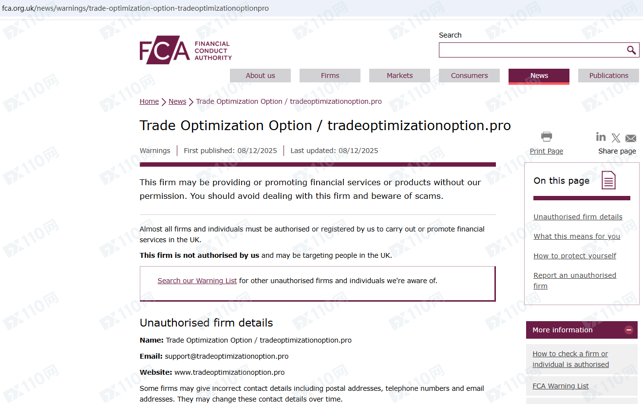 因未經授權許可提供金融產品投資服務,Trade Optimization Option已被英國FCA列入警示黑名單,請遠離!