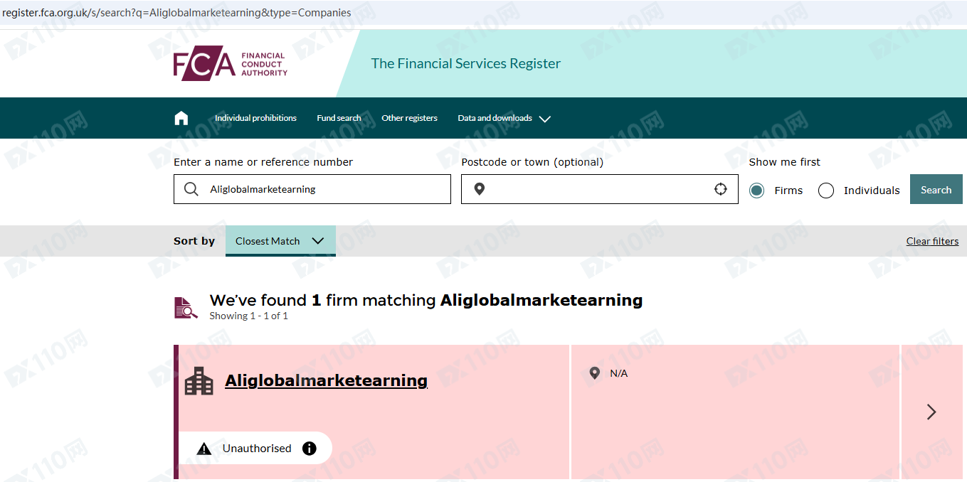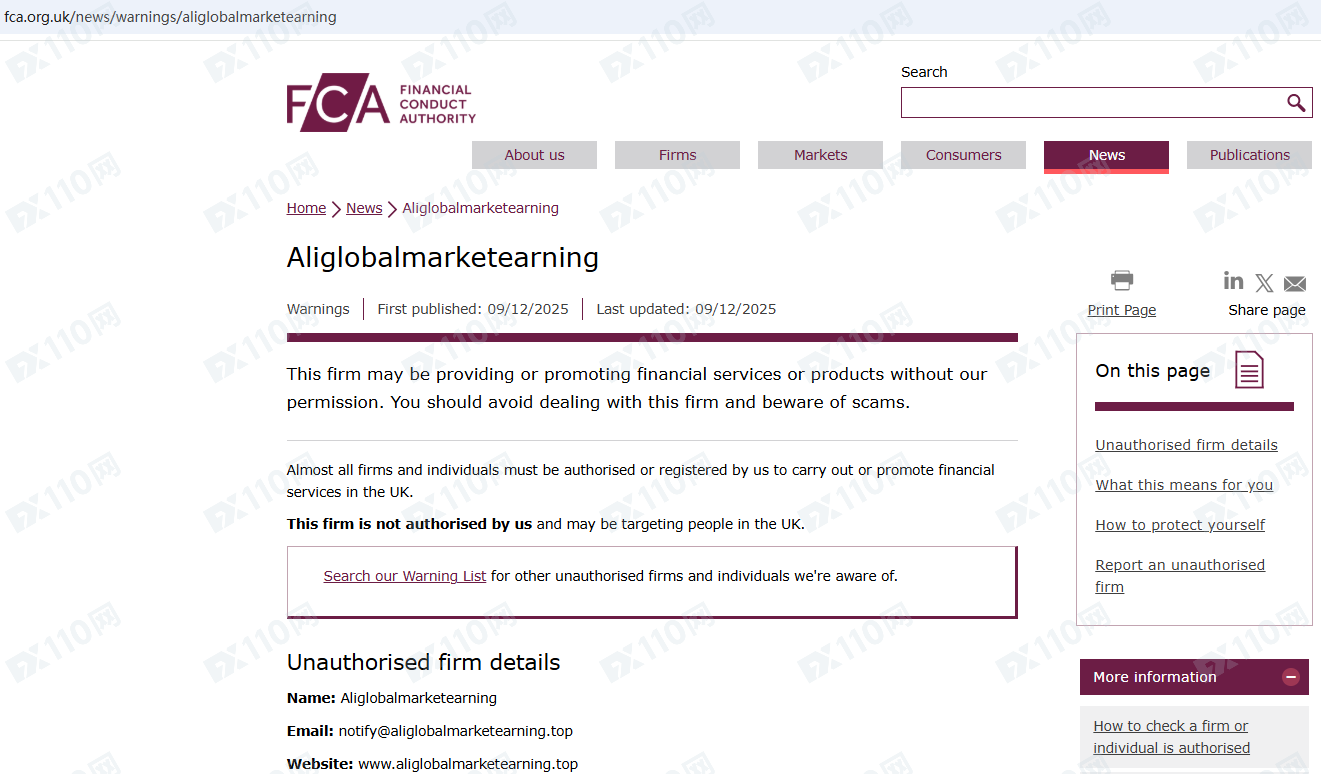 因未經授權許可提供金融產品投資服務,Aliglobalmarketearning已被英國FCA列入警示黑名單,請遠離!